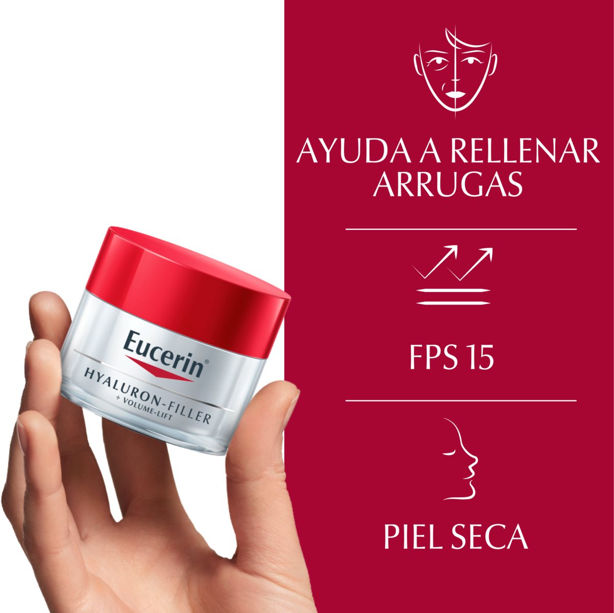 Eucerin Hyaluron-FillerVolumeLift Crema de Día para piel seca, que contiene tres ingredientes activos que actúan sobre las capas específicas de la piel, ha sido especialmente desarrollada para la piel floja o que experimenta pérdida de volumen o definición.