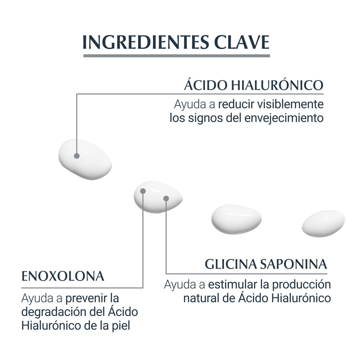 La mezcla única de Eucerin de Ácido Hialurónico de alto y bajo peso molecular, Glicina Saponina y Enoxolona proporciona un enfoque específico para ayudar a rellenar visiblemente incluso las arrugas más profundas. El Ácido Hialurónico de alto peso molecular mejora la hidratación y alisa las capas más externas de la piel, mientras que el Ácido Hialurónico de bajo peso molecular, que es 40 veces más pequeño1, penetra más en las capas epidérmicas de la piel cercanas a la dermis, donde se originan las arrugas más profundas. El antioxidante Glicina Saponina favorece la producción de Ácido Hialurónico en la capa dérmica, y protege de los radicales libres. La Enoxolona protege el Ácido Hialurónico propio de la piel de la degradación.