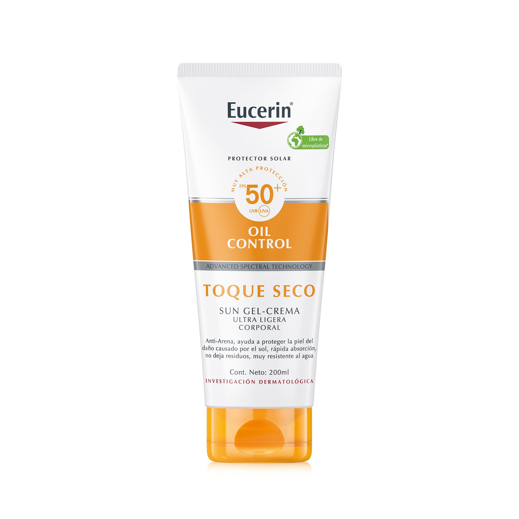 Eucerin Sun Oil Control Corporal Toque Seco Gel Crema FPS 50+ se absorbe rápidamente y no deja residuos en la piel. Es muy resistente al agua y anti-arena.