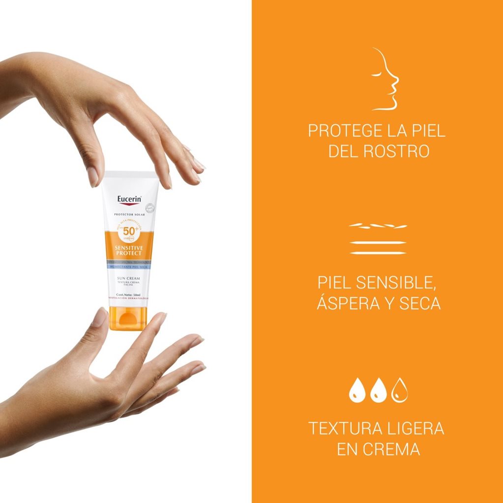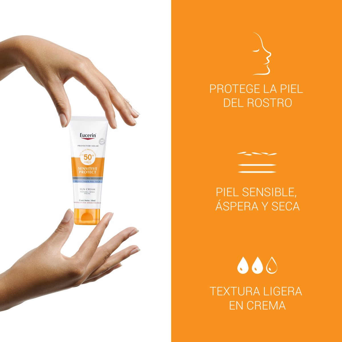 Eucerin Sun Cream Sensitive Protect FPS 50+ es un protector solar para el rostro, que protege la piel seca y sensible y la calma. La Advanced Spectral Technology combina filtros UVA/UVB fotoestables de banda ancha (1), que protegen la piel de la radiación UV, con Licochalcona A que neutraliza los radicales libres inducidos por los rayos UV y la luz de alta energía HEVIS. El protector solar para piel seca también contiene Ácido glicirretínico, el cual ayuda a fortalecer el mecanismo de reparación del ADN propio de la piel. Eucerin Sun Creme Sensitive Protect FPS 50+ tiene una textura ligera y cremosa. Su idoneidad para la piel sensible, e incluso para la piel atópica, está probada clínica y dermatológicamente.