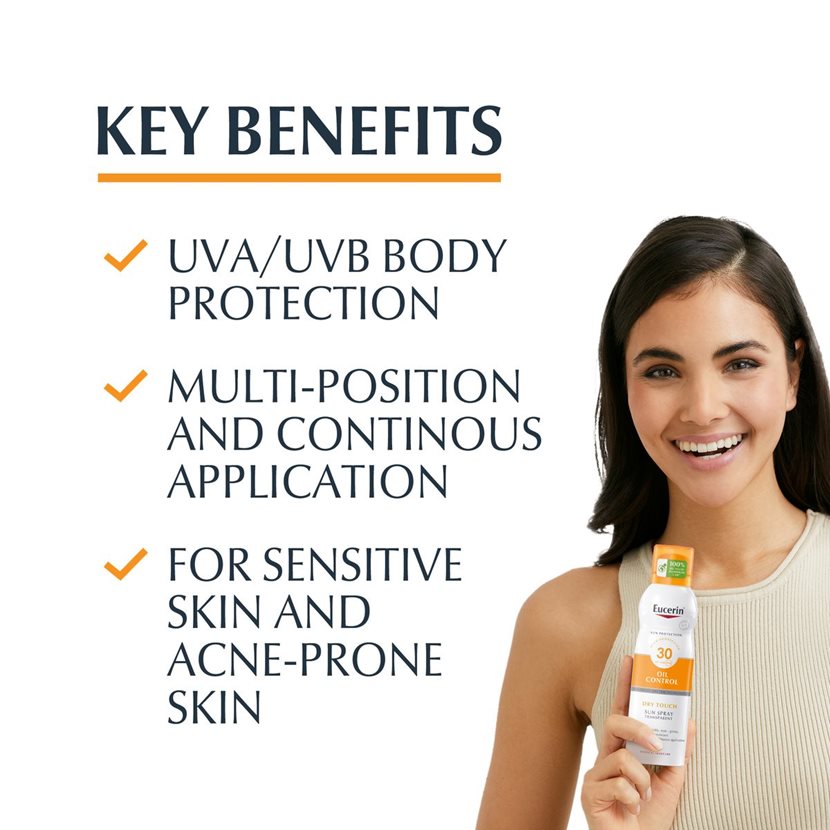Eucerin Sun Spray Corporal Toque Seco FPS 30 es un protector solar en spray transparente sumamente eficaz, desarrollado específicamente para la piel corporal sensible. Su sistema de filtros UVA/UVB, fotoestable de amplio espectro, protege la piel de los daños inducidos por el sol y cumple con la norma de Cosmetics Europe, The Personal Care Association (ex Colipa).